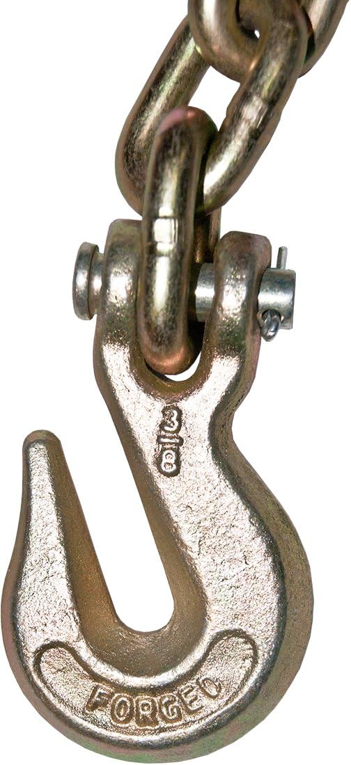 BRAND NEW Commercial Truck Tie down Chains. Grade 70/System 7 3/8" x 20' Long with Grade 70 Clevis Grab hook on both ends. Both Chain and Hook stamped with G70, to ensure proper DOT standardsStandard short link chain. This chain has the industry standard short links that fatigue less, last longer and provide more hooking points for your binders and hooks. These are the D.O.T. standard for all major transportation fleets in the United States and Canada. **Compare all chain before you buy, there is a difference and your loads safety depends on it! System 7 Grade 70 chain was designed for cargo securement, binding, towing and construction use. Also called Transport Chain, it averages a 20% higher load rating than High Test chain (S-4). Induction heat treated, the chain meets all requirements set forth by the DOT / CVSA / CHP for truck tie down use. Yellow zinc finish is standard on chain. These chains have a Working Load Limit of 6,600 lbs with a design factor of 4:1. Minimum breaking strength is 26,400 lbs. WARNING: Do not exceed WLL (working load limit) for any chain, tie down or cargo control device. Not approved for overhead lifting. New Federal and State D.O.T. rules effective January 1, 2004 require motor carriers to change the way they use cargo securement devices. Please check with your States D.O.T. office in regard to these changes. This chain will be shipped from our Atlanta based warehouse