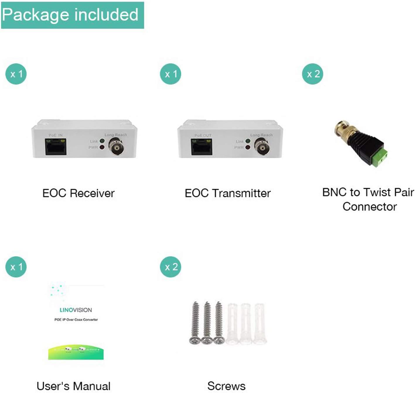 EOC (Ethernet Over Coax, also known as IP over Coax) Converter is used to transmit Video & Audio & Data over existing coaxial cables. Features with POE & IP data transmission, LINOVISION EOC converter is designed to upgrade traditional analogue video surveillance system to IP surveillance system without replacing coaxial cables. It is working with POE IP cameras, POE Wi-Fi AP, VoIP phones, etc. ApplicationIdeal for Security Video Systems, Video Switching system, Home Automation, Multi-media , Education systems, Access Control system, Information Diffusion system, etc; Package Included1 * Pair EOC Converter  (Transmitter and Receiver Included)2 * BNC to Twist pair connectors 1 * User Manual Warranty & Technical Support24/7 US local+ Global technical support1 years US local warrantyFree return in 30 days FAQ :Q: Why my POE device is offline when working with our EOC (IP Over Coax) Converter?1. Because of reverse connection. EOC transmitter should be connected to POE device (IPC/VoIP), and EOC receiver is connected to POE supply device (POE NVR, POE Switch or POE Injector). 2. It is used for point-to-point coax cable direct connection ONLY, no BNC repeater/T-connect/splitter in the middle.3. Because of insufficient load capacity. The maximum load capacity is 21W in 300ft transmission which is sufficient to power a regular IP PTZ camera. The load capacity can be at least 11W in 1000ft transmission which is sufficient to power most of IP cameras or VoIP phones.4. Because of no power supply. Please be informed that EOC receiver has to be connected to an POE NVR, POE Switch or POE Injector to be powered.