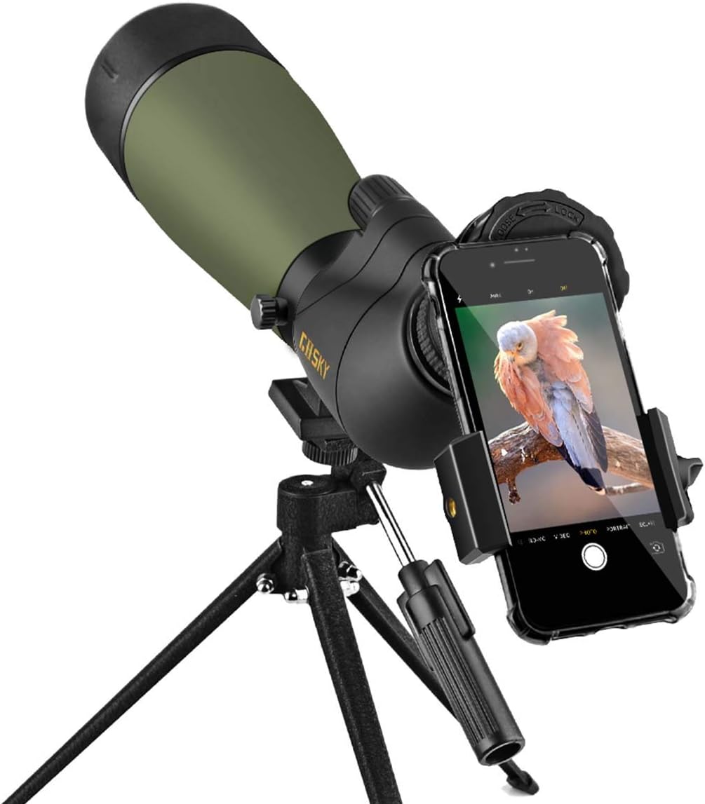 The Gosky updated 20-60x80 angled spotting scope comes with more powerful magnifications, better optical performance and more stable focusing system. It has durable framework and rubber armor, which provide non-slip grip, shock-proof grip and durable external lasting protection, enable the scope to withstand the toughest environments. This spotting scope is the best choice for outdoor enthusiasts and bird watchers. It is perfect for target shooting, archery, hunting, bird watching, wildlife watching, hiking, camping, scenery, outdoor sporting, astronomical observation etc. Main Features and Advantages âœ" Variable 20x to 60x zoom magnification and dynamic lens focusing system -- makes it easy to zoom in on target in detail. âœ" Fully multi-coated green film eyepiece lens helps to acquire a clearer, brighter and higher-contrast view. âœ" 80mm large objective lens to ensure the light-gathering power and high resolution, as well as large field of view range. âœ" 45 degree angled eyepiece provides more comfortable viewing, come with tripod allows rotation of the eyepiece to a sideways position, providing adjustable viewing angles. âœ" Durable framework and high-quality rubber armor provide non-slip grip, shock-proof grip and durable external protection. âœ" Waterproof, fogproof, shock-proof performances allow the scope to be used in all weather conditions. âœ" The retractable sun shade can be stretched out to protect the eyepiece and helps reduce glare.. Advanced FMC 80mm Objective Lens With Advanced Fully Multi-coated 80mm Green Film Glass Lenses, you can enjoy a good clarity and brightness. The quality BAK4 Porro prism optics increases light transmission, delivers bright, clear, high-contrast images even in low-light conditions. 20-60X Zoom& 45 degree Angled Eyepiece Variable 20x to 60x magnification and dynamic lens focusing system for close-up and long range views - makes it easy to zoom in on target. 45 degree angled eyepiece provides more comfortable viewing Rotatable Eyepiece & Retractable Sun Shade The eye piece can be adjusted to any viewing position by simply loosening the adjustment collar on the center of the body to fit any situation. The retractable sun shade and inside threads helps helps reduce glare. Read more Wide Applications: Target shooting Lock the shooting target and witness the sharp shooting skills of the sharpshooter. Archery No problem seeing archery target spotters and scoring disc in the archery field. Animals & birds watching Best choice for bird watchers and animal lovers. You can go to parks, zoos, forests and other outdoor to see the lovely animals and birds. Moon observation Excellent optical performance can see the moon crater and other planets. Good partner for astronomy enthusiasts. Read more Comes with a quick aligned phone adapter - Enjoy Capturing and Sharing! Comes with a quick aligned cell phone adapter, you can take pictures and video of what you observe, Capture beauty of the distant world, share it with your friends and family.The smartphone adapter is compact, light weight and very easy to handle. It is compatible with almost all smartphone on the market. It is Compatible with phone 12Pro Max, 12 Pro, 12, 12mini, 11Pro Max, 11 Pro,11, SE, Xs,Xr, X, 8 plus, 8, 7plus,7, 6plus, 6,5s,5, 4s, Samsung M30, S20, S20+,S20FE, S10, S10+, S10E, S8, S7, S6, S5, S4, Note20, Note20 Ultra, Note10+, Note 10, Note 9, Note 6, Note 5, Note 4,A51,A71,A70 and many more. (Note: For all spotting scopes, the original picture is in a circle, please zoom the camera to get a full screen picture.) Specification: Magnification: 20x -60x Objective lens diameter: 80mm Eyepiece diameter: 20mm Prism: BAK4 Exit Pupil: 3.3-1.22mm Eye relief: 17.9-15mm Field of View: 82.9-48ft/1000yards Read more Read more