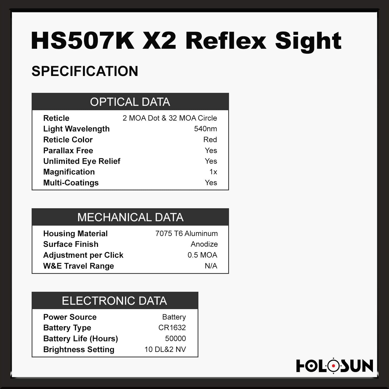 - LONG BATTERY LIFE: The HS507K-X2 optic uses a high capacity lithium ion battery with up to 50,000 hours of battery life to power the optic.