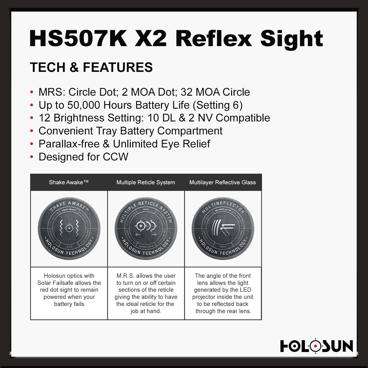 Features of HOLOSUN - HS507K-X2 Classic Multi Reticle Red Dot Sight (Black)