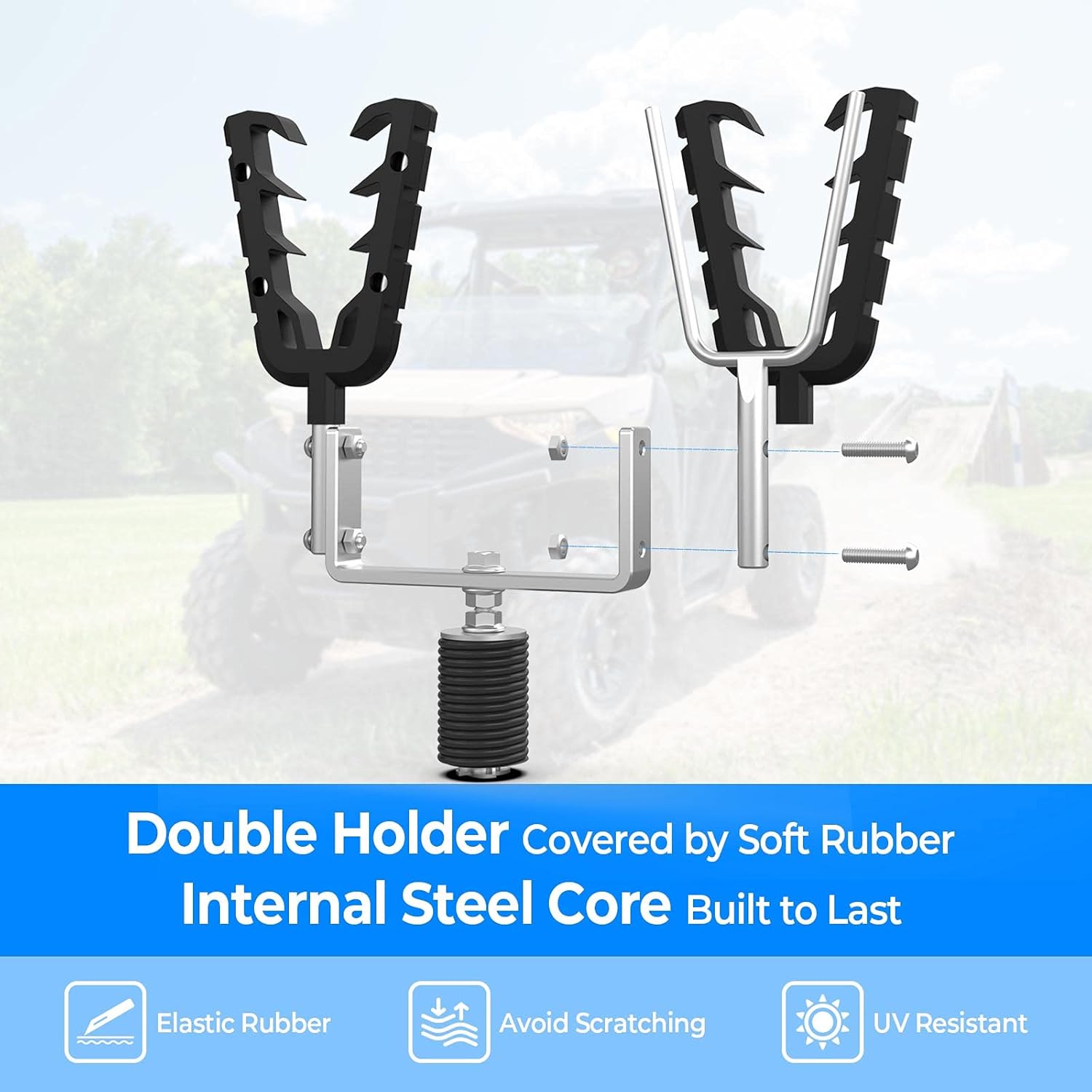 - WIDE APPLICATION: Double Gun and Bow Rack can be used on UTVs to hold your gears side by side such as rifles, shotguns,bows, fishing poles, shovels, ice augers and so on.