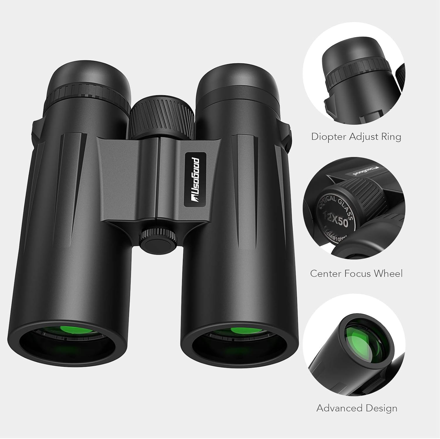 HD Roof Prism Binoculars for Bird Watching Bird watching binoculars has phase-coated, premium BaK4 prism glass, which provides sharp, true-to-life color of observed subjects. Wide field of view brings you great viewing experience. Great All-around Binocular The binoculars for stargazing and planets is an excellent choice for just about any activity, from the outdoors to the ballpark such as concerts, climbing, hiking, driving, watching wildlife, travel and so on, which also a great gift to surprise your friends and families. Take Precious Photos Anywhere and Anytime The binocular with tripod will be your great outdoor partner. Use tripod adapter to mount the binocular on a tripod for take good picture anytime, and then share them with your friends and family. Read more Usogood binoculars are ideal for casual outdoor activities The slim body and comfortable grip ensure easy handling. Images are sharp and bright due to the multilayer-coated lenses and high-reflectivity prism coating. Soft, rubber eyecups are comfortable to use and block stray light. Eyeglasses wearers can fold down the eyecups for easier viewing. How to use the binoculars? How to focus? Step1: Make sure to open the dust cover of the eyepiece and objective lens. Then close the right eye. And adjust the central focus knob. Knob until the left sight is clear. Step2: Close the left eye. Rotate right eyepiece focusing knob. Knob until the image is sharp and clear. Step3: Bend the binoculars until you can get a single circular view. Step4: Rotate and adjust the eyecups until there are no shadows and black edges on the edges or in the field of view. Clear lenses of smudges, fingerprints, or eyelash oil. Fog the lenses with your own breath, then use a nonabrasive lens cloth to clean the lenses. Read more Package Included >1x Binoculars >1x Smartphone Adapter >1x Tripod >1x Carrying bag(with strap) >1x Eyepiece and Lens Covers >1x Cleaning Cloth >1x Straps >1x User Manual Usogood Binoculars is Your First Option Zoom the wonderful world for you SPECIFICATIONS >Magnification: 12x>Object diameter: 50mm>Eye Cups Type: Twist-up>Focus System: Center and right eye ring>View of field: 102m/1000m(294ft/1000yds)>Angle of field: 5.6°>Eye Relief: 15.5mm>Waterproof & Fogproof: Yes>Product weight: 439g/0.97lb You can use this binoculars in weak light condition but not in completely darkness.It can resist light water but can not be used in a heavy rain for a long time or soaked in the water. Discover surprises in the world with Usogood binoculars and share the beauty you find. Read more Read more